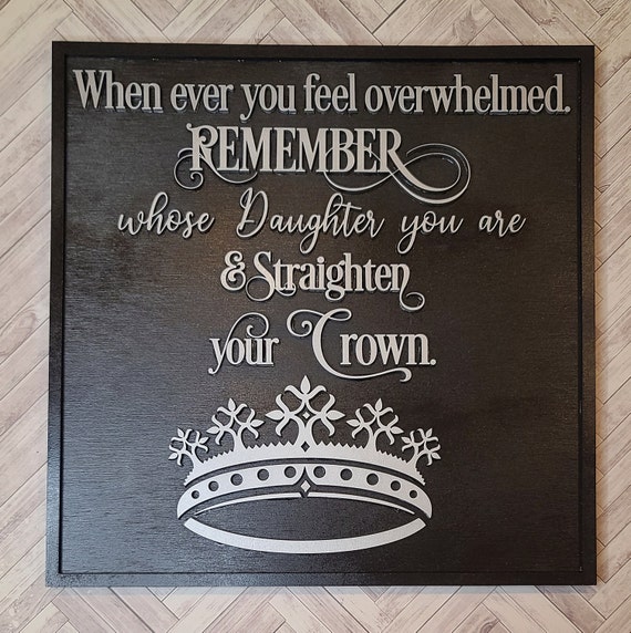 Whenever you feel overwhelmed, remember whose daughter you are and straighten your crown necklace, daughter inspired gifts,inspirational. 20% coupon applied at checkout. The day to day can feel overwhelming, much less the year to year to do list. 4.7 out of 5 stars. To my daughter leather journal, remember whose daughter you are and straighten your crown, pu leather inspirational gift travel journal 4.8 out of 5 stars 43 $13.99 $ 13. We all have those days that just don't go as planned. More images for straighten your crown daughter » When you feel overwhelmed remember whose daughter you are and straighten your crown, gift for her, wood sign, girls room, dorm room sign. 5 out of 5 stars. 5 out of 5 stars. Inspire daughters, granddaughters, nieces, and girls everywhere with this sentimental mantra for female empowerment. "straighten your crown" may be metaphorical — the daughter may not actually be royalty — but whether she is or not, she is enjoined to hold her head high and straight, thus to maintain her dignity. We can all relate to feeling like we have too much on our plate and we just don't know how we are going to do it all.